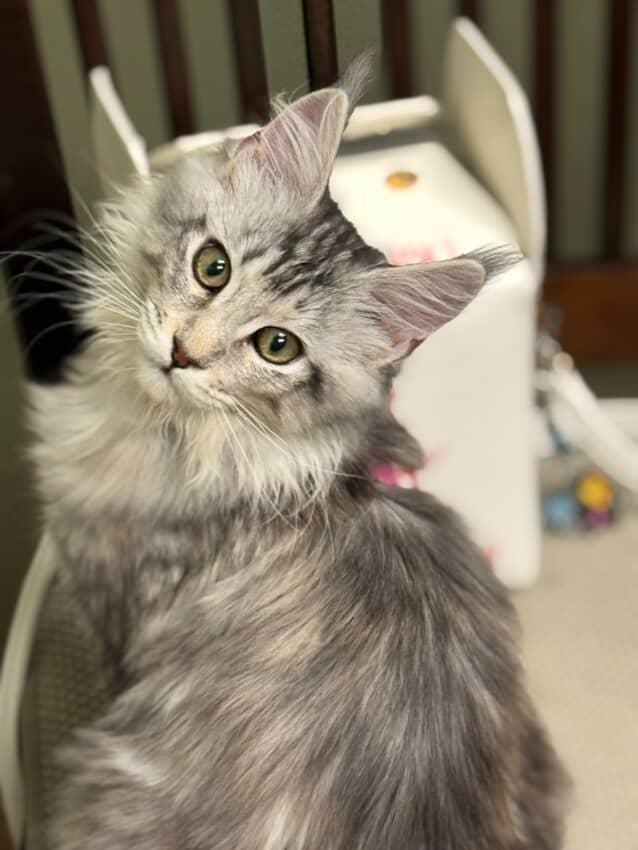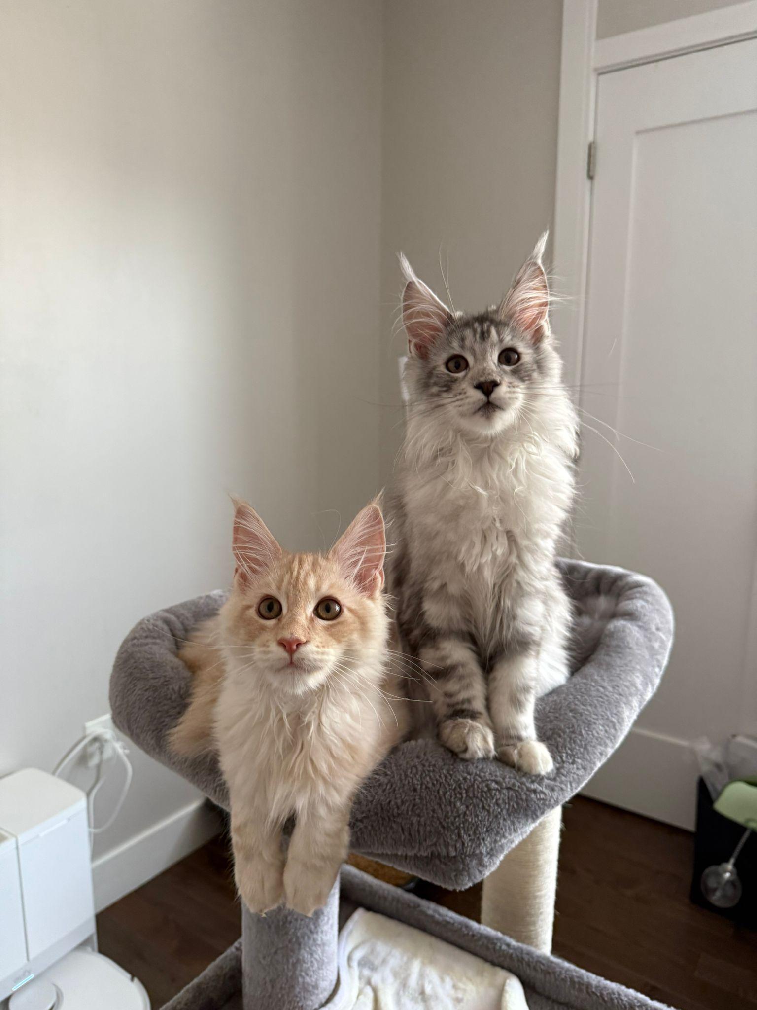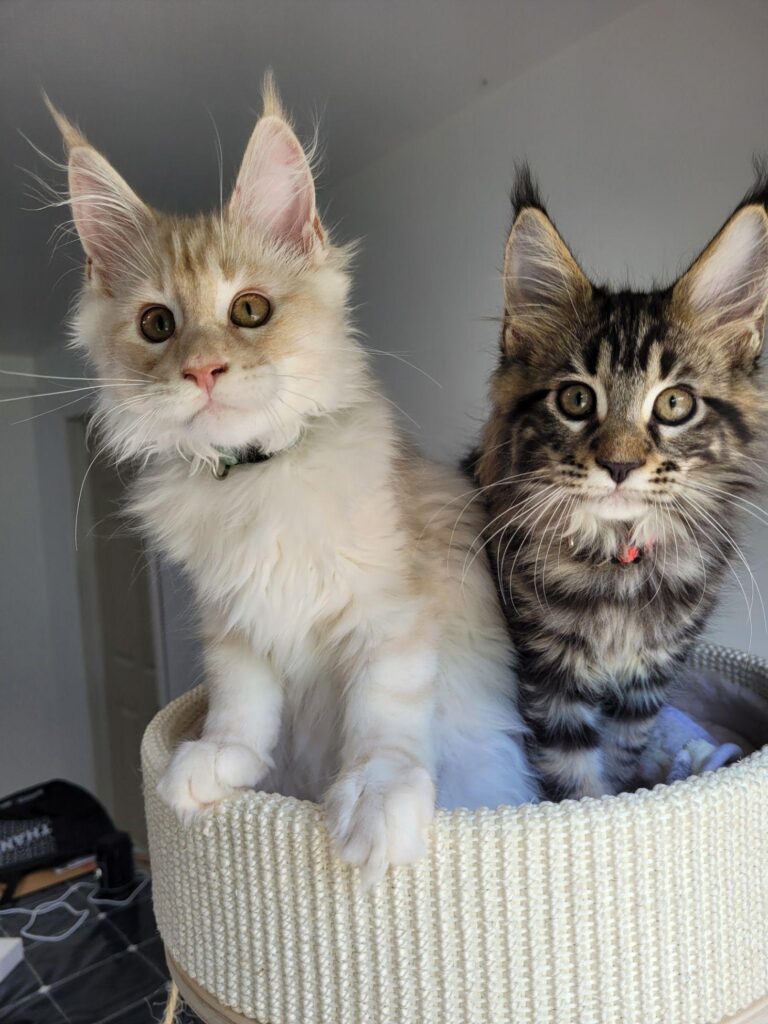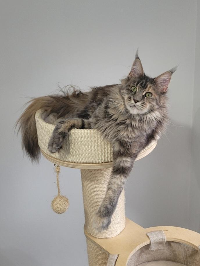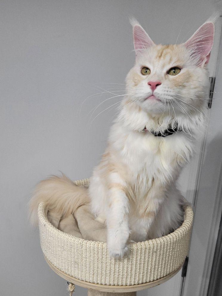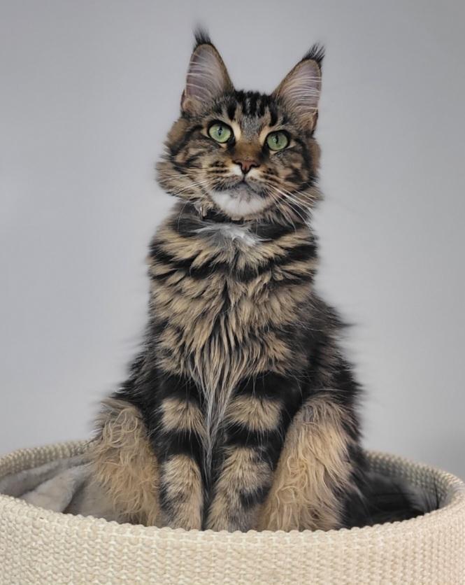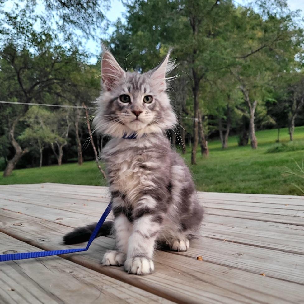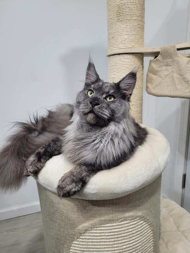 The Maine Coon is a large, and magnificent cat breed known for its large tufted ears, squared muzzle, bushy tail (reaching up to 16 inches long), a long rectangular body, and a friendly dog-like personality. Intelligent, inquisitive, and talkative, often expressing themselves through adorable chirps and trills. They are quick to learn tricks and respond well to positive reinforcement, particularly when treats are used as motivation. Maine Coons are gentle, playful and affectionate cats with a calm and easygoing nature. These qualities make them wonderful companions for families and individuals alike, providing loyal and loving company in any home!